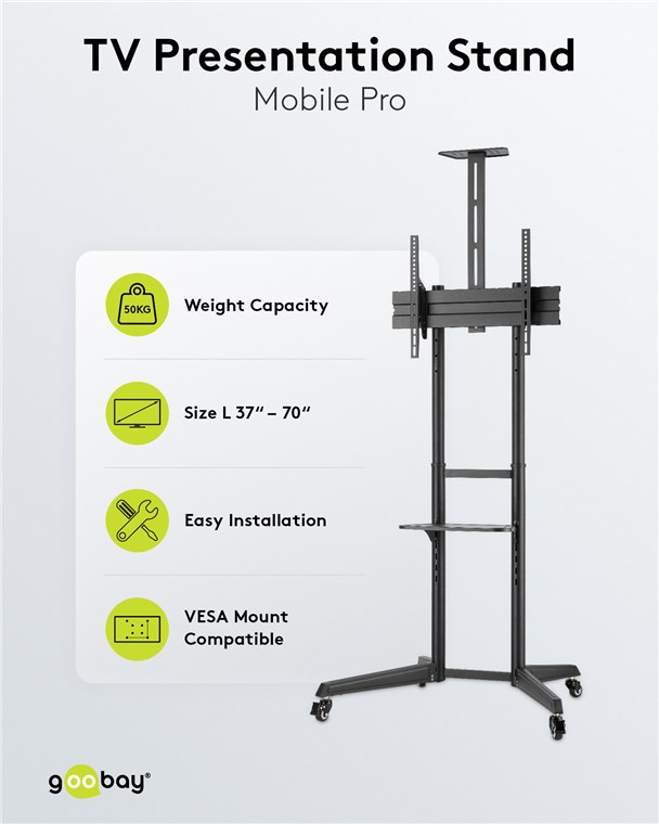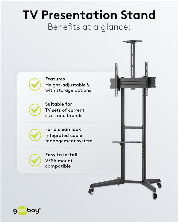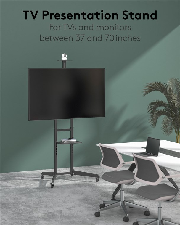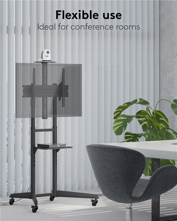 • Support TV mobile avec 4 roulettes verrouillables pour une utilisation flexible au bureau, dans les salles de formation ou dans les zones d'accueil