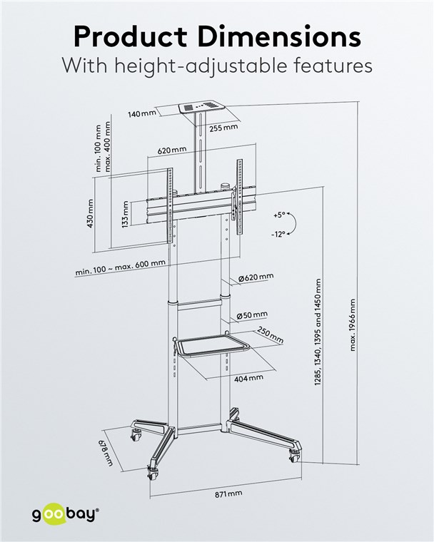 • Avec 4 niveaux de hauteur pour le téléviseur, qui s'enclenchent facilement grâce à un système à clic (téléviseur inclinable de -12/+5°)