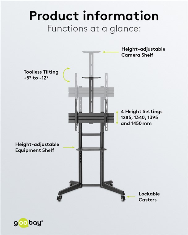 Une mobilité totale pour ton contenu : Grâce à ses roulettes, le support TV est le choix idéal pour une utilisation mobile lors de conférences, dans les salles de cours et les espaces d'accueil. Place tes présentations ou écrans d'information là où ils seront vus. Le support télescopique, le support inclinable et les 4 niveaux de hauteur différents garantissent un angle de vue parfait partout. Particularité : le support de caméra réglable en hauteur.