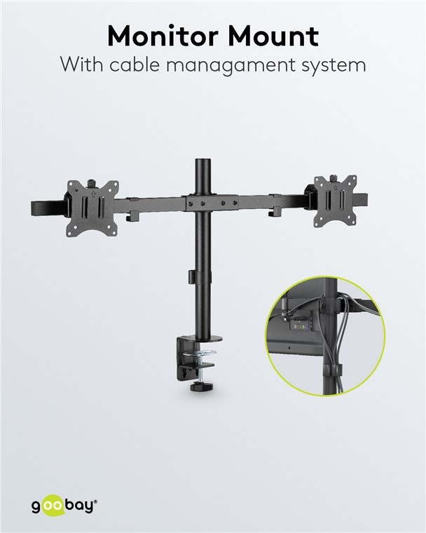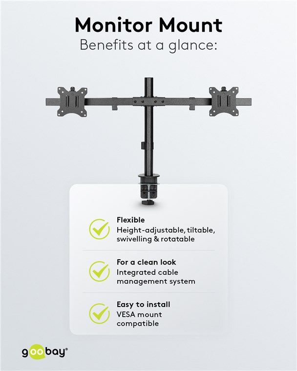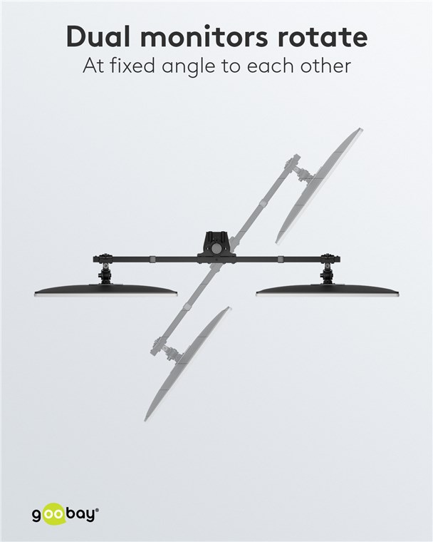 - Parfait pour le montage stable sur table de deux écrans jusqu'à 9 kg chacun, réglable en hauteur, inclinable à 45°, pivotant à 15°, rotation à 180