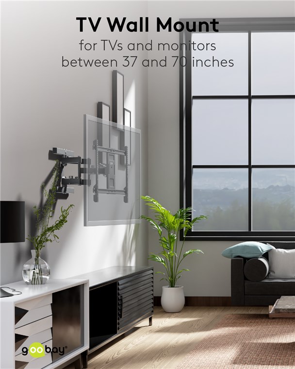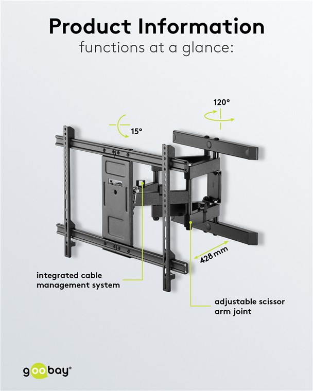 Le mouvement complet de montage pour la plupart de 37 à 70 pouces (94–178 cm) TV jusqu'à 60 kg. Le support fournit l'angle d'inclinaison optimal d'une distance de la paroi allant jusqu'à 428mm. Full Motion permet une flexibilité maximale. Vous pouvez incliner, casserole, étendre et nivelé à regarder votre téléviseur à partir d'un siège dans la chambre. Tout cela sans outils. La mise à niveau après l'installation assure que le téléviseur est parfaitement positionné sur le mur. Le système de gestion des câbles intégré organise et protège le câble.
