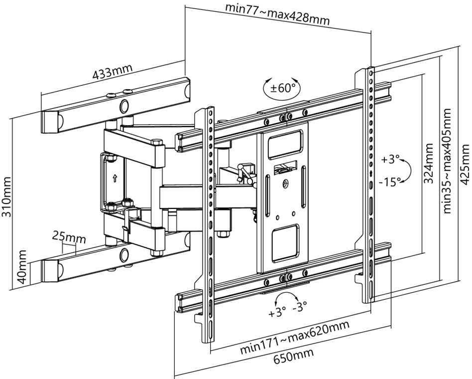 - Le support mural maintient le téléviseur en position avec seulement 77 mm, élégamment plat et peu encombrant sur le mur, et peut être étendu jusqu'à 428 mm pour obtenir un angle de vision optimal.