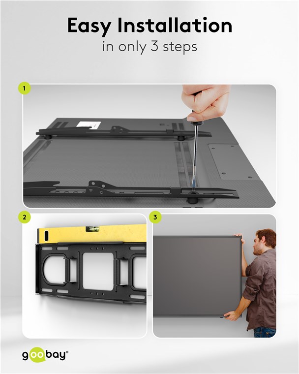 - Accrochage facile : Dans un premier temps, visser les rails de fixation sur le téléviseur, dans un deuxième temps, les accrocher au support au choix au niveau de hauteur 1 ou 2