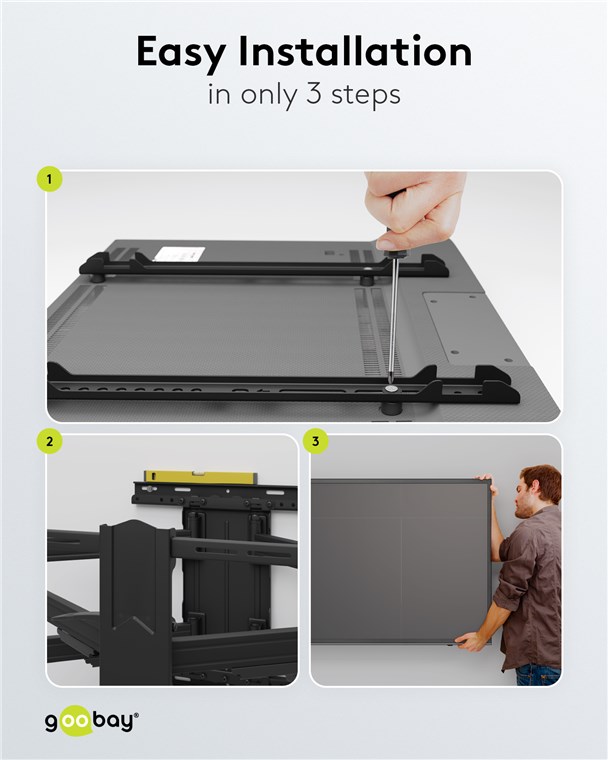 • convient à la plupart des téléviseurs plats et courbes de toutes les marques populaires (par exemple Samsung (également QLED et LED), Sony, Philips, LG) et de toutes les tailles (par exemple 40", 43", 49", 50", 55", 58", 65")