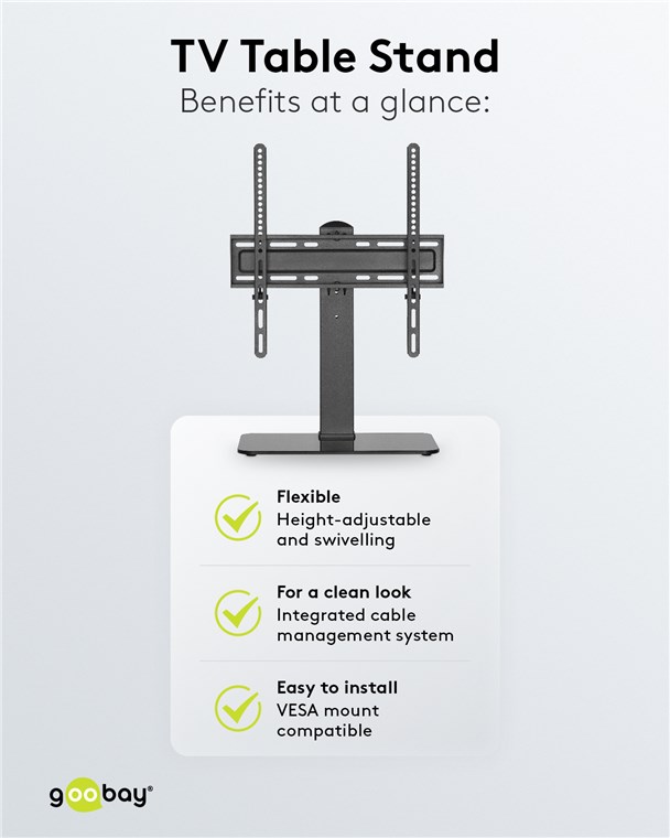 Pour les téléviseurs qui veulent être vus. Le pied en verre séduit par son look élégant en noir brillant et est idéal pour poser les télécommandes, les récepteurs ou les lecteurs Blu-ray. Quand ce pied de table est-il le support idéal ? Si tu souhaites placer ton téléviseur sur un meuble TV ou dans un coin où il n'est pas possible d'installer un support mural. Rapide et facile à installer, tu peux immédiatement commencer ton marathon télévisuel.