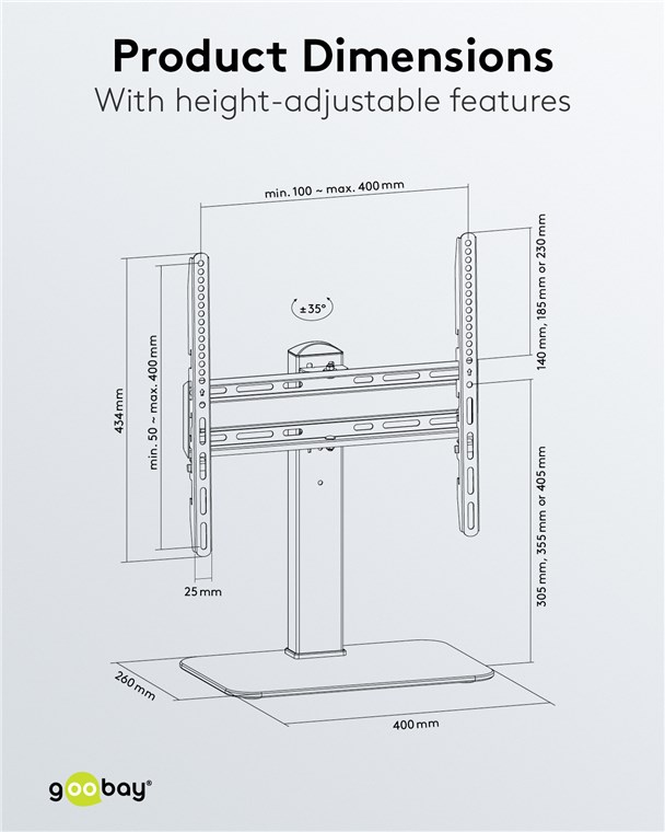 - Le support TV est compatible avec la norme VESA 400x400 mm ainsi qu'avec toutes les dimensions VESA plus petites