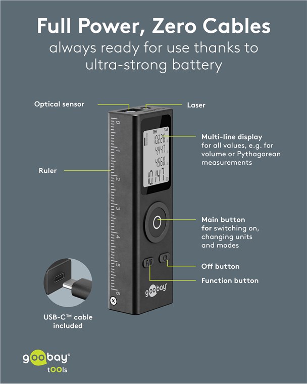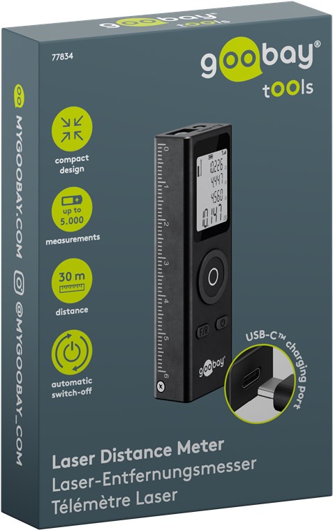 - Câble de chargement de 30 cm (USB-C™ vers USB-A) et dragonne inclus pour une manipulation aisée du télémètre laser