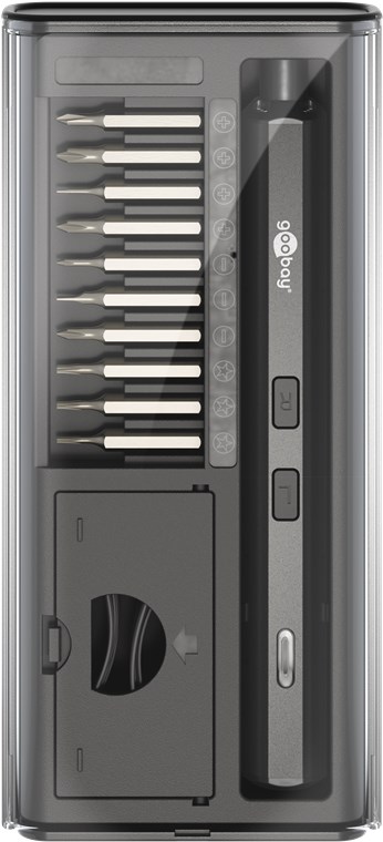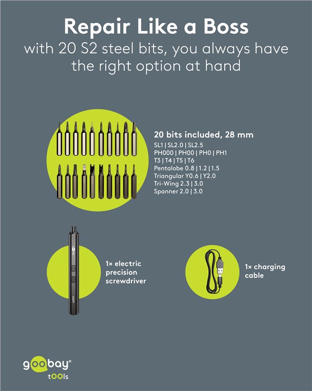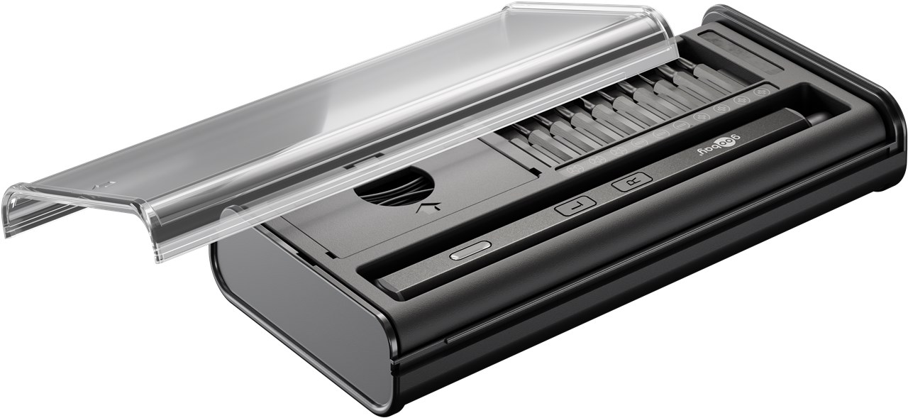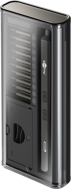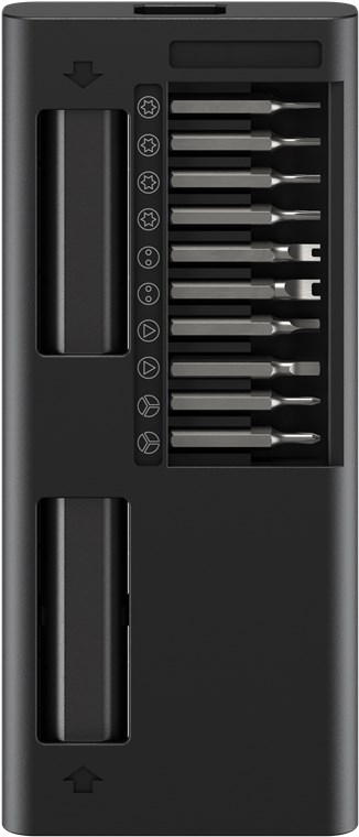 • 20 embouts inclus : 3x fente, 4x cruciforme (PH), 4x étoile (T), 3x pentalobe, 2x tri-wing, 2x triangulaire, 2x embout U