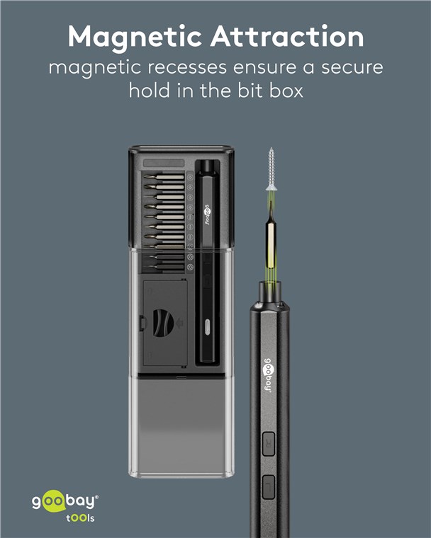 Élégant en aluminium : Le tournevis électrique séduit par son design métallique élégant et son maniement confortable. Sa particularité : Le boîtier est doté de rainures aimantées dans lesquelles les embouts trouvent un maintien sûr.
