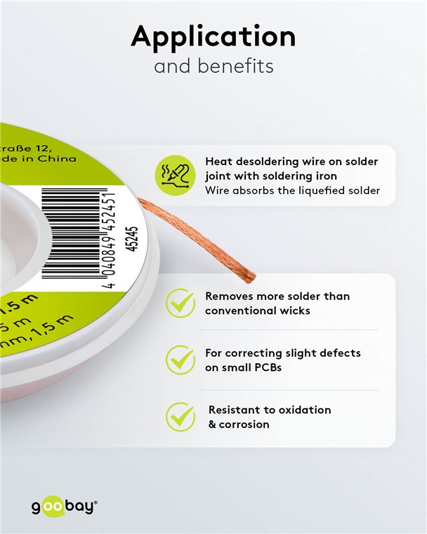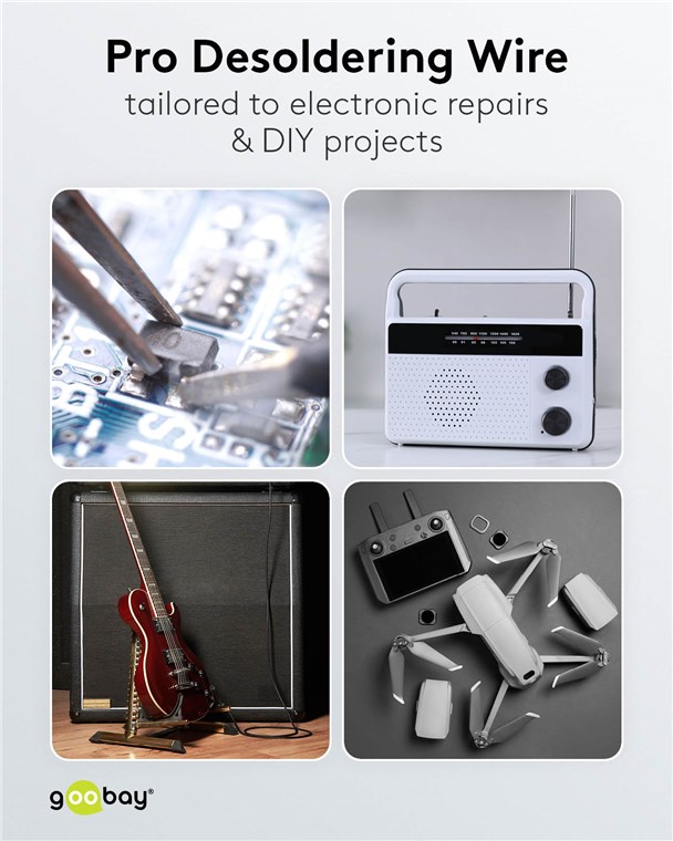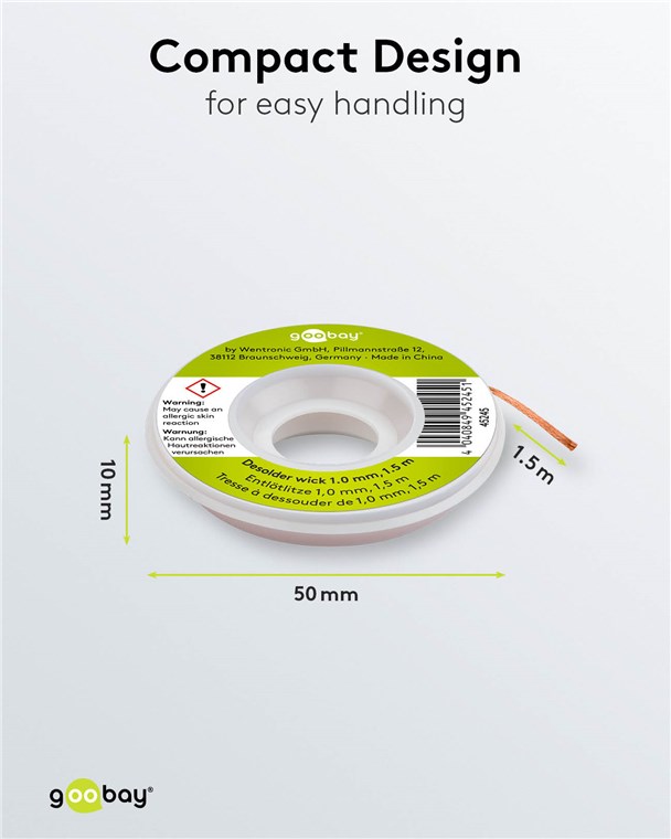 Fil de dessoudage pour petits joints de soudure, qui convient même aux endroits difficiles d'accès grâce à son excellent comportement à la flexion. Grâce à un fort effet capillaire, le fil à dessouder élimine efficacement et proprement l'étain de soudure fondu.