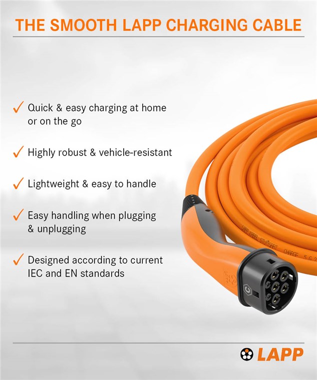 • Le câble de charge de Type 2 de LAPP permet une charge simple et rapide jusqu'à 22 kW sur une station de charge publique ou privée ou une Wallbox.