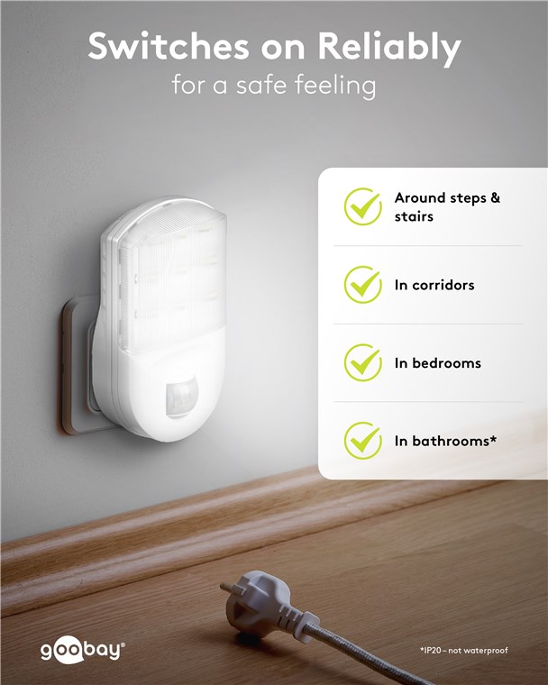 Une sensation de sécurité garantie : La veilleuse avec détecteur de mouvement Goobay évite de manière fiable les risques de trébuchement à la tombée de la nuit et dans l'obscurité, p. ex. lorsque vous entrez dans votre appartement ou que vous vous levez la nuit. Pour un confort parfait et une orientation sûre.
