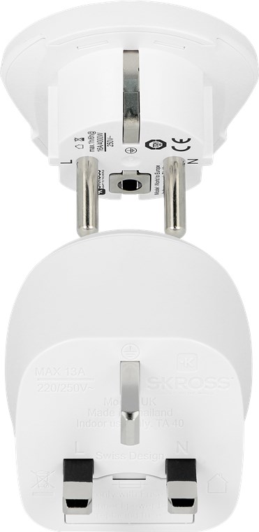 Gli adattatori di SKROSS sono la soluzione ideale per i viaggiatori internazionali che desiderano collegare i propri dispositivi elettrici alla rete elettrica in paesi con standard britannici. Gli hotel e gli organizzatori di seminari offrono ai loro ospiti una comoda opzione di connessione per i dispositivi che portano con sé grazie all'adattatore.