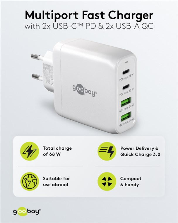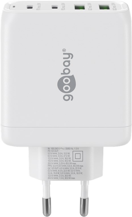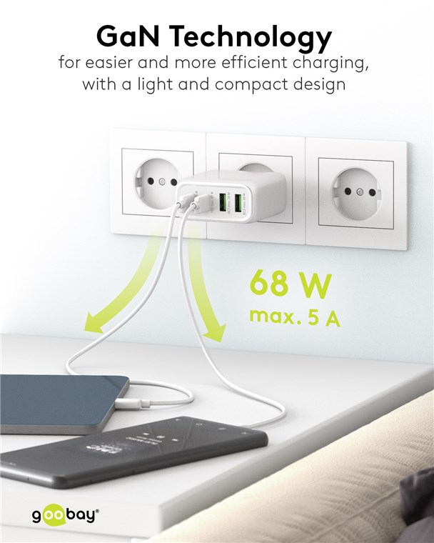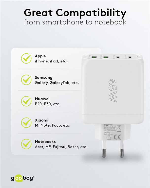 Porte flessibili, prestazioni potenti, elevata efficienza energetica e design compatto: tutto questo in un unico adattatore di ricarica. L'alimentatore di Goobay è l'alimentatore perfetto a casa e in viaggio e ricarica in modo affidabile e rapido qualsiasi dispositivo, dalle cuffie Bluetooth ai computer portatili. Semplicemente. Tutto. Ciò che serve!