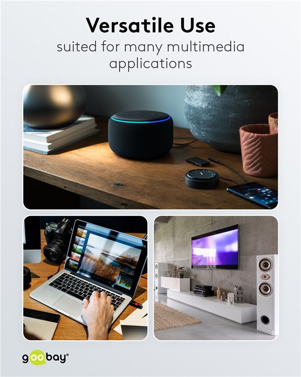 - Cavo audio per il collegamento di smartphone, PC o sistema home cinema con presa jack a dispositivi di uscita come altoparlanti, TV, amplificatore o SoundBar con connessioni cinch
