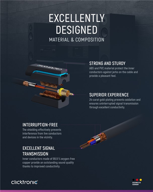 Clicktronic attribuisce grande importanza alla durata e alla stabilità. La nostra promessa di qualità: 10 anni di garanzia sui nostri cavi RCA. La costruzione del connettore in tre parti fatta di componenti in PVC e ABS compensa la trazione a scatti del cavo, rendendolo idealmente protetto contro la rottura del cavo. I contatti placcati in oro di alta qualità e i conduttori di rame puro trasmettono i segnali nella massima qualità del suono per un'esperienza sonora perfetta. La costruzione robusta del marchio dei nostri cavi audio assicura così un intrattenimento domestico di lunga durata.