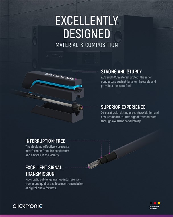 Clicktronic attribuisce grande importanza alla durata e alla stabilità. La nostra promessa di qualità: 10 anni di garanzia sui nostri cavi Toslink. La costruzione brevettata dei nostri cavi di collegamento li rende estremamente robusti. La costruzione del connettore in tre parti, fatta di componenti in PVC e ABS, compensa la trazione a scatti del cavo, rendendolo idealmente protetto contro le rotture del cavo. I contatti placcati in oro di alta qualità e le fibre ottiche polimeriche trasmettono i segnali audio digitali e ottici nella massima qualità del suono per un'esperienza sonora perfetta. La costruzione robusta del marchio dei nostri cavi audio assicura così un intrattenimento domestico di lunga durata.