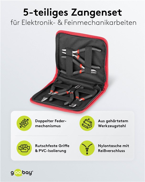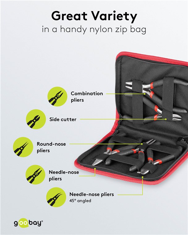 • Pinze per elettronica di alta precisione in un set composto da 1x pinza a becchi lunghi, 1x pinza a becchi piegata a 45° (pinza telefonica), 1x pinza a becchi tondi, 1x tronchese, 1x pinza combinata