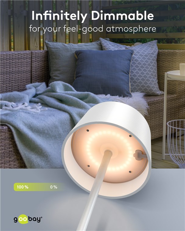 - Grazie alla protezione dagli spruzzi d'acqua (grado di protezione IP44), la lampada da tavolo è perfetta anche per il patio, il balcone o il giardino