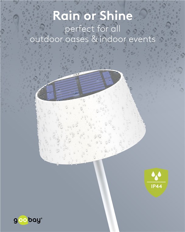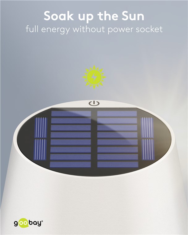 Con il suo design minimalista e scandinavo, la lampada da tavolo valorizza qualsiasi soggiorno, camera da letto o sala da pranzo e fa bella mostra di sé anche in occasione di una festa in giardino. Con la possibilità di ricarica ecologica tramite il pannello solare integrato, la lampada di Goobay è sinonimo di sostenibilità e durata.