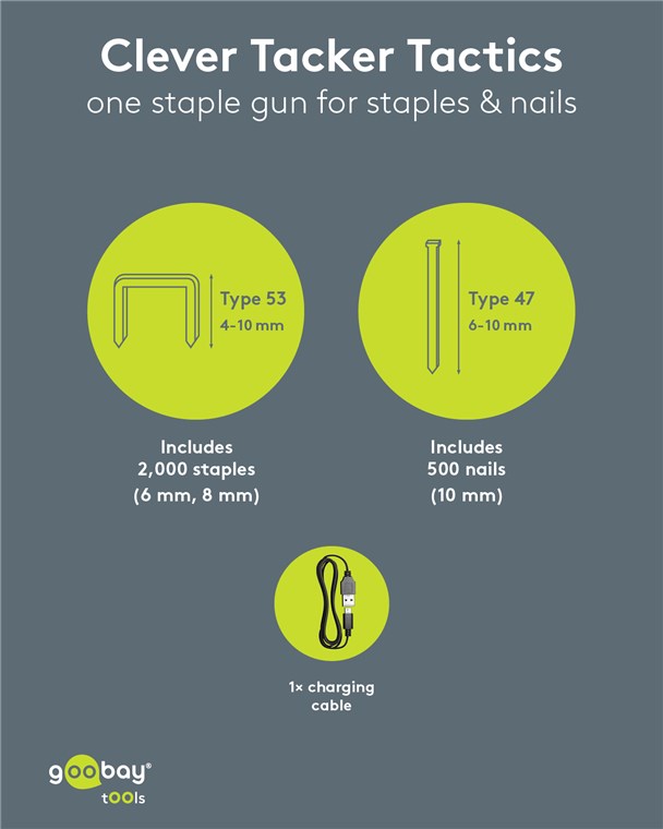 1000 punti metallici (6 mm), 1000 punti metallici (8 mm), 500 chiodi (10 mm), cavo di ricarica USB-C™ a USB-A