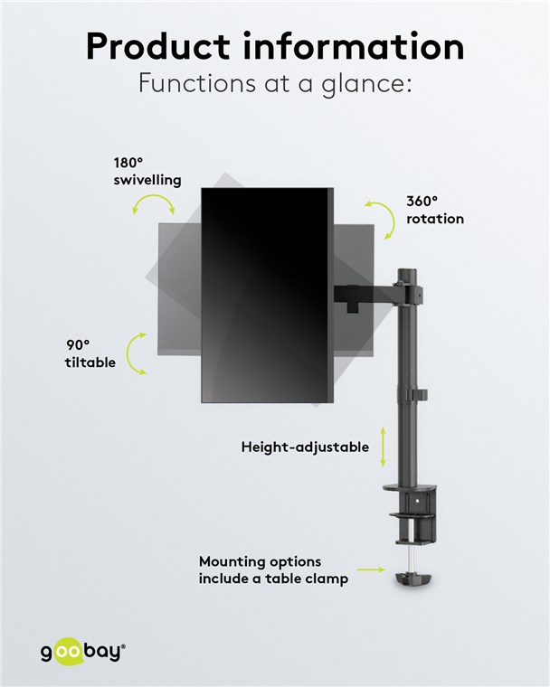 - Perfetto per il montaggio stabile sul tavolo di uno schermo fino a 8 kg tramite un morsetto, regolabile in altezza, inclinabile di 90°, girevole di 180°, rotazione di 360°