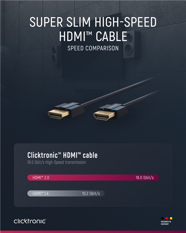 Clicktronic attribuisce grande importanza alla durata e alla stabilità. La nostra promessa di qualità: 10 anni di garanzia sui nostri cavi HDMI™. La costruzione brevettata dei nostri cavi di collegamento li rende estremamente robusti. La costruzione del connettore in tre parti fatta di componenti in PVC e ABS compensa la trazione a scatti del cavo, rendendolo idealmente protetto contro la rottura del cavo. I contatti placcati in oro di alta qualità e i conduttori di rame puro trasmettono i segnali audio e video nella massima qualità per una perfetta esperienza di home cinema e di gioco. Il cavo Clicktronic Ultra-Slim HDMI™ High-Speed permette un'immagine nitidissima e ha una velocità di trasmissione estremamente veloce.