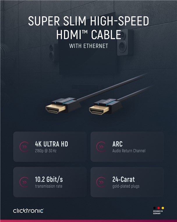 Clicktronic attribuisce grande importanza alla durata e alla stabilità. La nostra promessa di qualità: 10 anni di garanzia sui nostri cavi HDMI™. La costruzione brevettata dei nostri cavi di collegamento li rende estremamente robusti. La costruzione del connettore in tre parti fatta di componenti in PVC e ABS compensa la trazione a scatti del cavo, rendendolo idealmente protetto contro la rottura del cavo. I contatti placcati in oro di alta qualità e i conduttori di rame puro trasmettono i segnali audio e video nella massima qualità per una perfetta esperienza di home cinema e di gioco. Il cavo Clicktronic Ultra-Slim HDMI™ High-Speed permette un'immagine nitidissima e ha una velocità di trasmissione estremamente veloce.