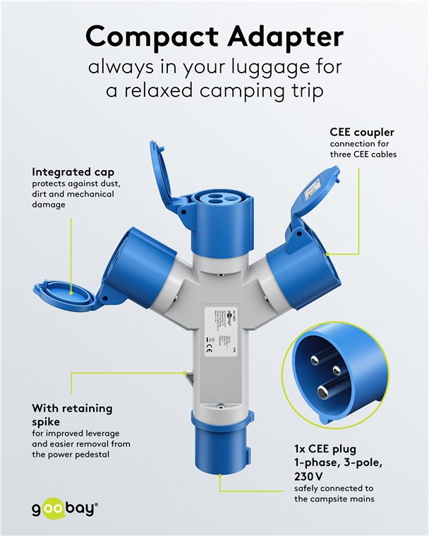 • Rozszerza pojedyncze złącze CEE na kempingowych punktach zasilania do trzech gniazd CEE