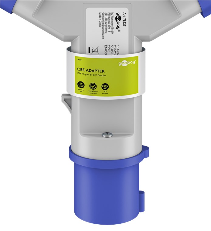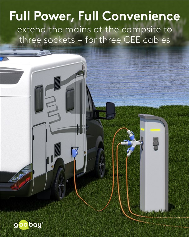 • Podstawowe akcesorium kempingowe: Adapter CEE z gniazdem combi do podłączania kamperów, przyczep kempingowych lub samochodów kempingowych do sieci elektrycznej na kempingu
