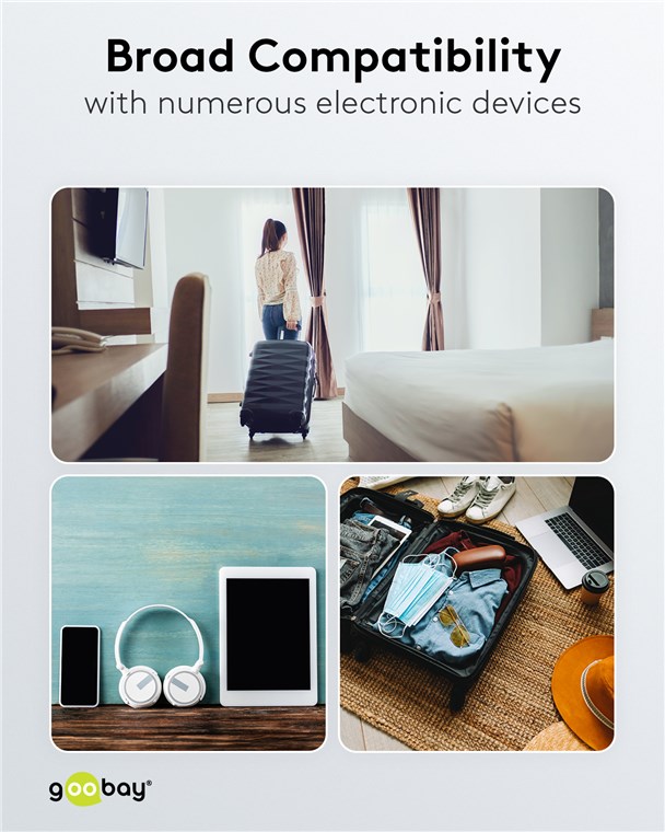 - Dzięki kompaktowej konstrukcji adapter gniazdka można schować w bagażu, aby zaoszczędzić miejsce