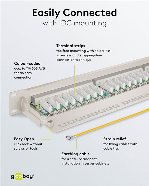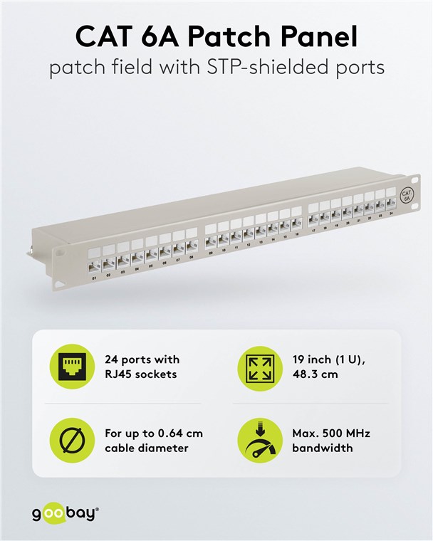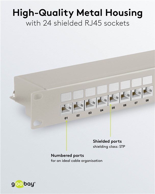 Nasze panele krosowe mają solidną metalową obudowę z ekranowanymi gniazdami dla doskonałego połączenia. Wyposażony w 8, 12 lub 24 porty, wszystkie potrzebne kable LAN mogą być wygodnie podłączone do patch panelu. Goobay zawsze ma odpowiedni produkt dla Twojego połączenia sieciowego. Po prostu. Wszystko. Czego potrzebujesz!