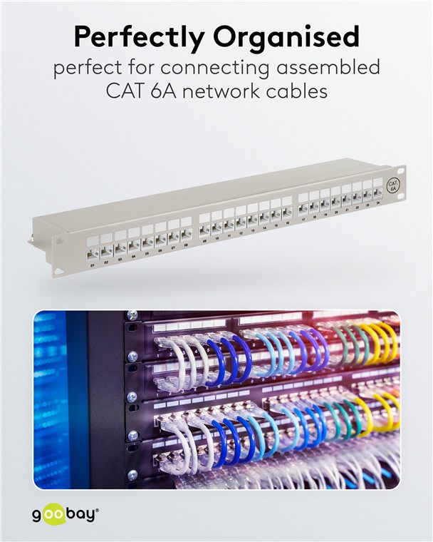 • 24-portowy patch panel z gniazdami RJ45 do łączenia zmontowanych kabli sieciowych CAT 6A
