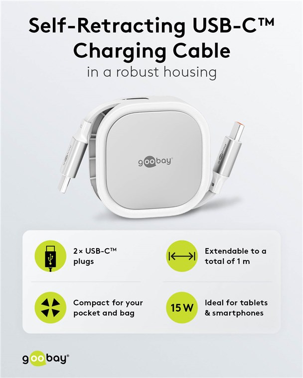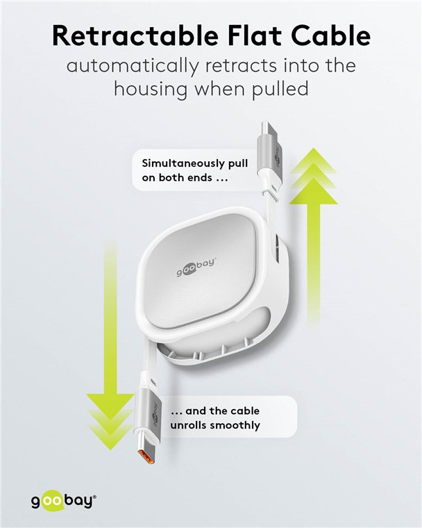 - Rozciągliwy, płaski kabel USB-C™ do ładowania w kompaktowej obudowie, idealny do transportu w torbie bez splątanych kabli lub ich przerwania
