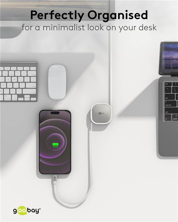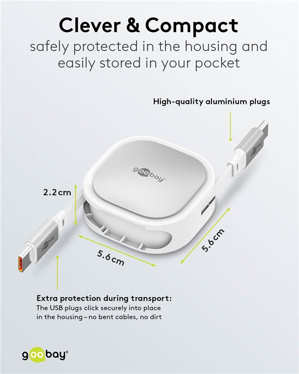 Putting the fun in function: Ręczne zwijanie kabli to już przeszłość, ponieważ zintegrowany mechanizm zwijający automatycznie chowa kabel do obudowy. Optymalnie chroniony i ultrakompaktowo zwinięty kabel ładujący jest niezastąpionym towarzyszem w podróży – koniec z łamaniem kabli i bałaganem w torbie! Pudełko z obudową jest niewiele większe od herbatnika i łatwo mieści się w każdej torbie.