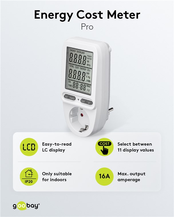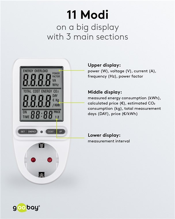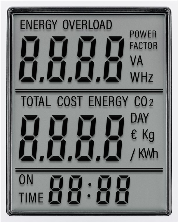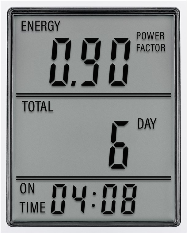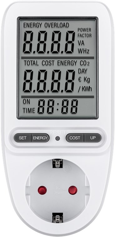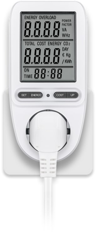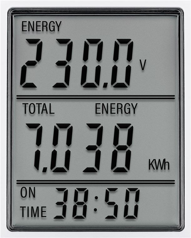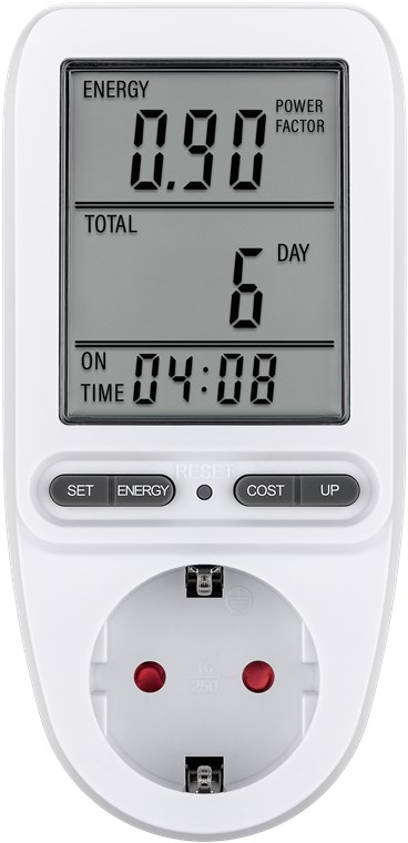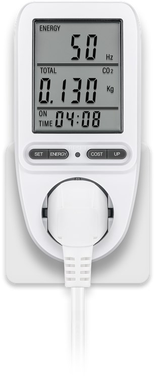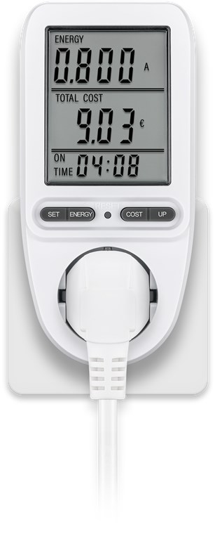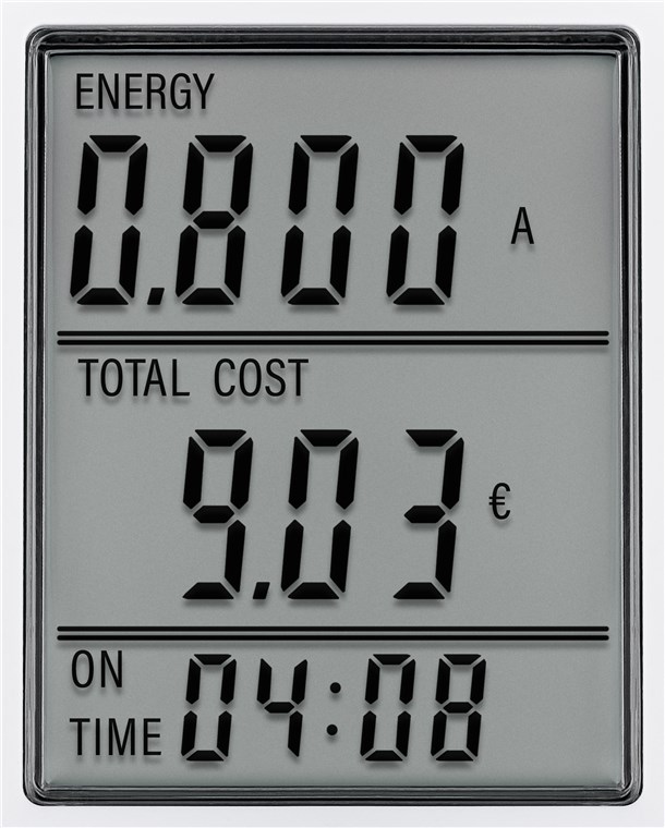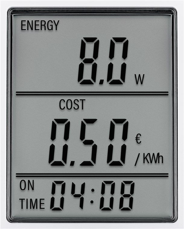 - Miernik zużycia prądu z czytelnym, trzywierszowym wyświetlaczem LCD pokazującym jednocześnie zużycie energii, koszty energii i czas zużycia energii