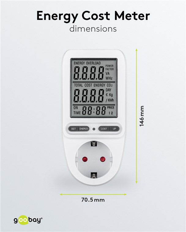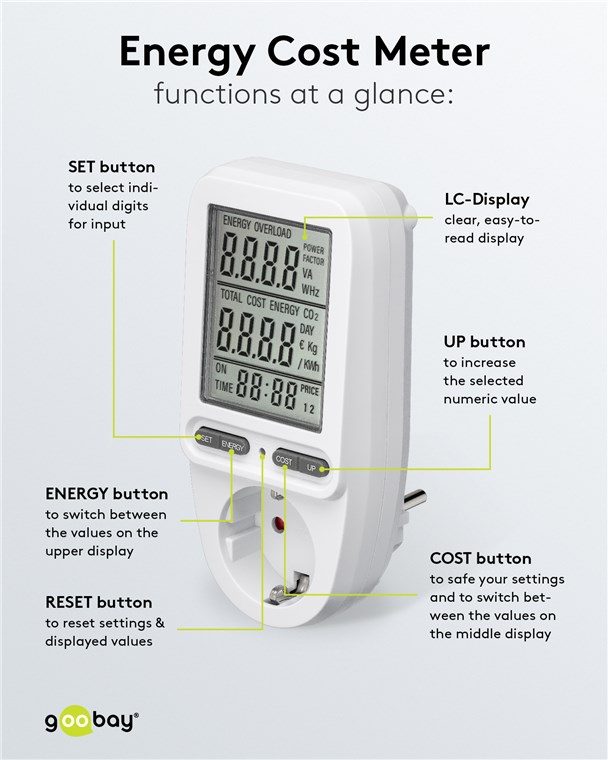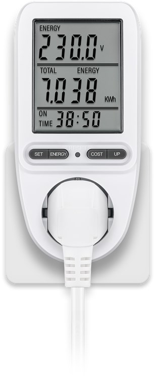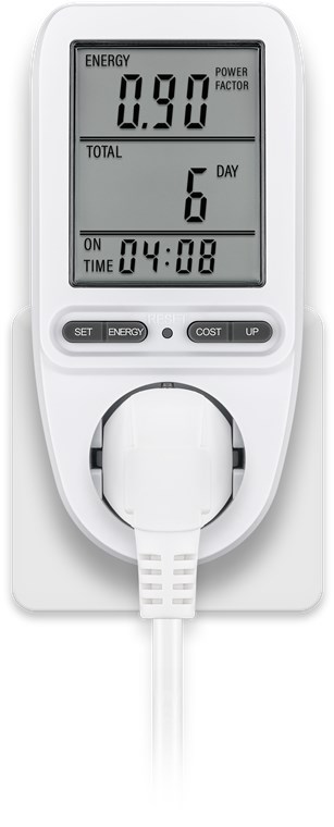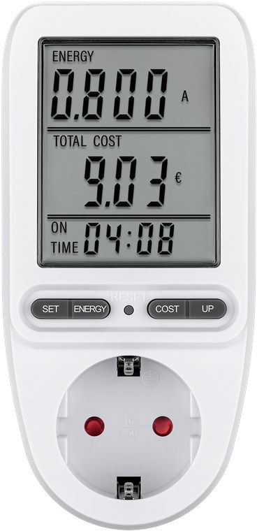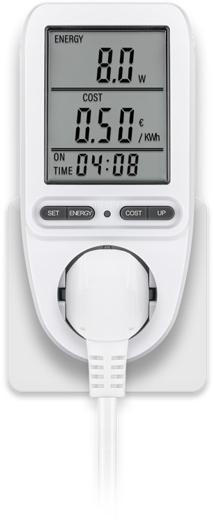 - Licznik energii elektrycznej oblicza koszty eksploatacji urządzeń gospodarstwa domowego i pomaga określić potencjał oszczędności, np. dla lodówek, pralek, komputerów, telewizorów i lamp podłogowych