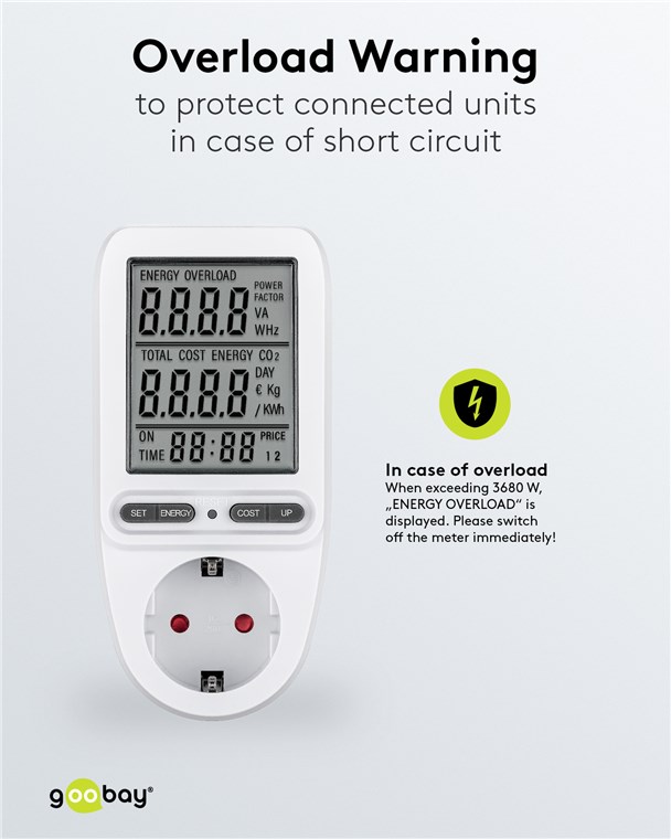 - Miernik energii elektrycznej do gniazdka o stopniu ochrony IP20 nadaje się wyłącznie do użytku wewnątrz pomieszczeń