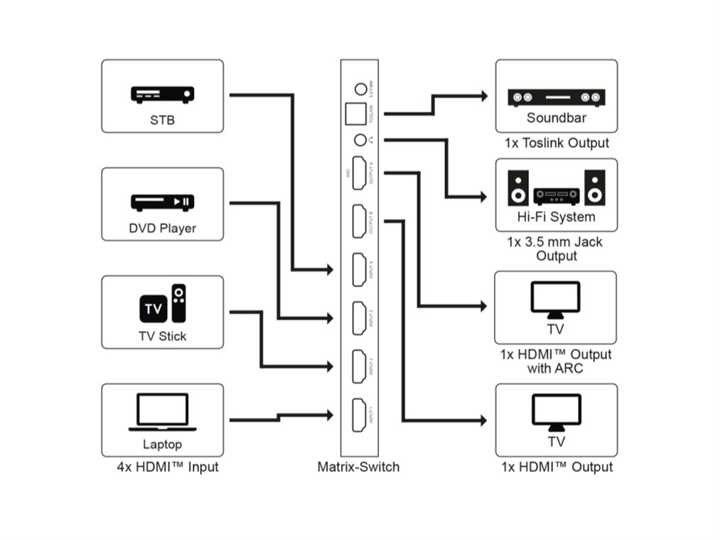 Użyj przełącznika matrycowego, aby uzyskać maksymalną elastyczność przy podłączaniu ekranów HDMI™ i urządzeń końcowych. Przełącznik pozwala na przełączanie pomiędzy różnymi źródłami i terminalami za pomocą pilota, bez kłopotliwego ponownego podłączania kabli.