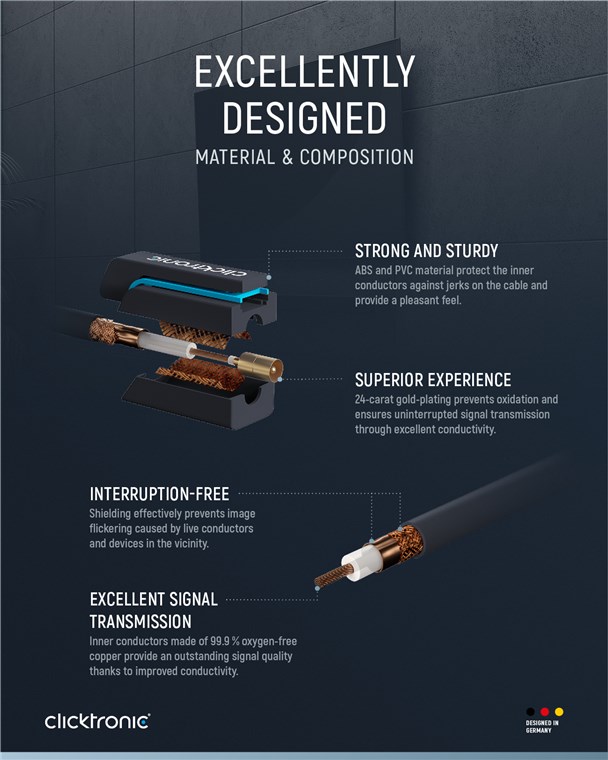Clicktronic przywiązuje dużą wagę do trwałości i stabilności. Nasza obietnica jakości: 10 lat gwarancji na nasze kable antenowe. Własna konstrukcja naszych kabli połączeniowych sprawia, że są one niezwykle wytrzymałe. Trzyczęściowa konstrukcja złącza wykonana z PVC i ABS kompensuje szarpnięcia kabla, dzięki czemu jest ono idealnie zabezpieczone przed zerwaniem. Wysokiej jakości pozłacane styki i przewody z czystej miedzi gwarantują szybką transmisję danych. Wytrzymały płaszcz z PVC chroni kabel koncentryczny i zapewnia długotrwałe, stabilne połączenie.