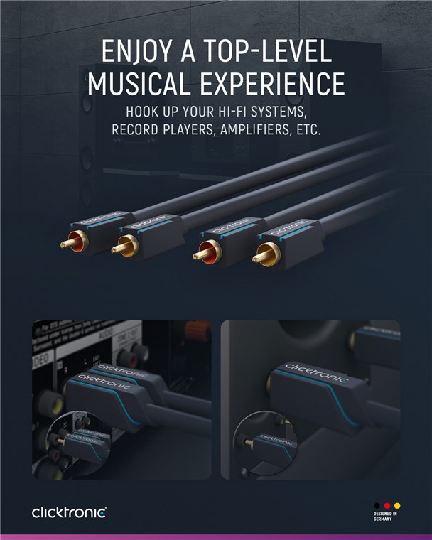 - Kabel audio Clicktronic z 2-krotnym ekranowaniem z folii aluminiowej i miedzianym oplotem zapewniającym doskonałą jakość sygnału