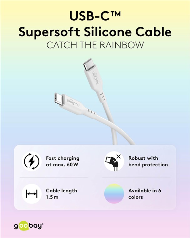 Stay fresh, stay smooth: W inspirujących kolorach kabel podkreśla osobisty styl każdego sprzętu technicznego. Idealny jako akcent na każdym biurku, podczas ładowania w podróży lub w biurze. Kabel USB jest również technicznym przełomem: Super miękka silikonowa osłona skutecznie zapobiega splątaniu, a jednocześnie zapewnia płynną elastyczność – koniec z łamaniem się kabla, nawet przy częstym użytkowaniu.