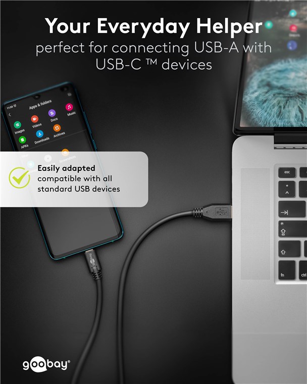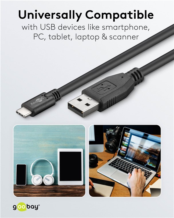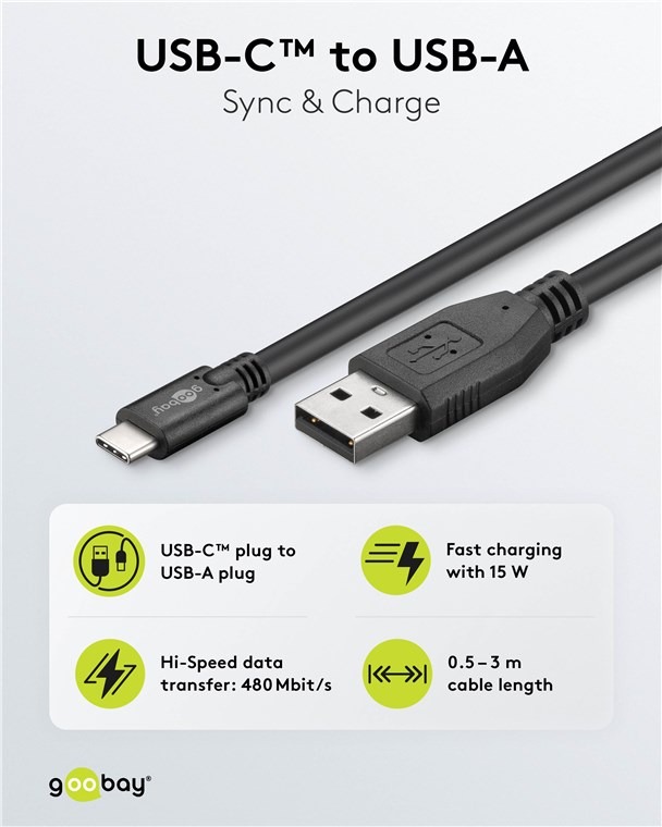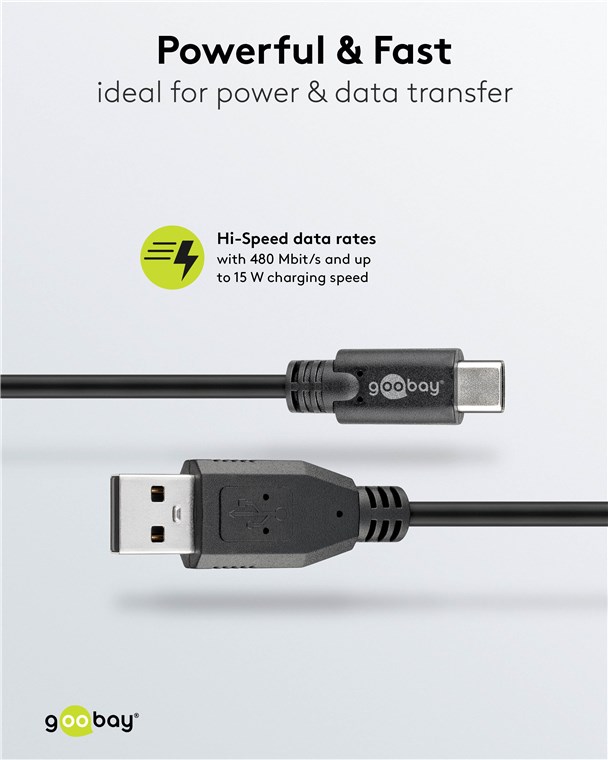 • Kabel firmy Goobay ładującyUSB-C™ do superszybkiego ładowania prądem o natężeniu maks. 3 A