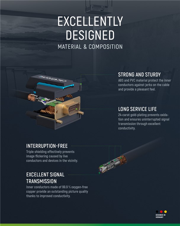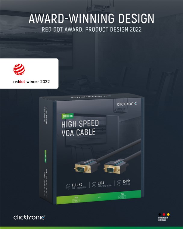Clicktronic przywiązuje dużą wagę do trwałości i stabilności. Nasza obietnica jakości: 10 lat gwarancji na nasze kable VGA. Własna konstrukcja naszych kabli ekranowych sprawia, że są one niezwykle wytrzymałe. Trzyczęściowa konstrukcja złącza wykonana z PVC i ABS kompensuje szarpnięcia kabla, dzięki czemu jest ono idealnie zabezpieczone przed zerwaniem. Wysokiej jakości pozłacane styki i przewodniki z czystej miedzi przesyłają sygnał wideo w najwyższej jakości, zapewniając doskonałe wrażenia podczas oglądania filmów i grania. Kabel Clicktronic VGA umożliwia uzyskanie ostrego obrazu i charakteryzuje się bardzo dużą szybkością transmisji.