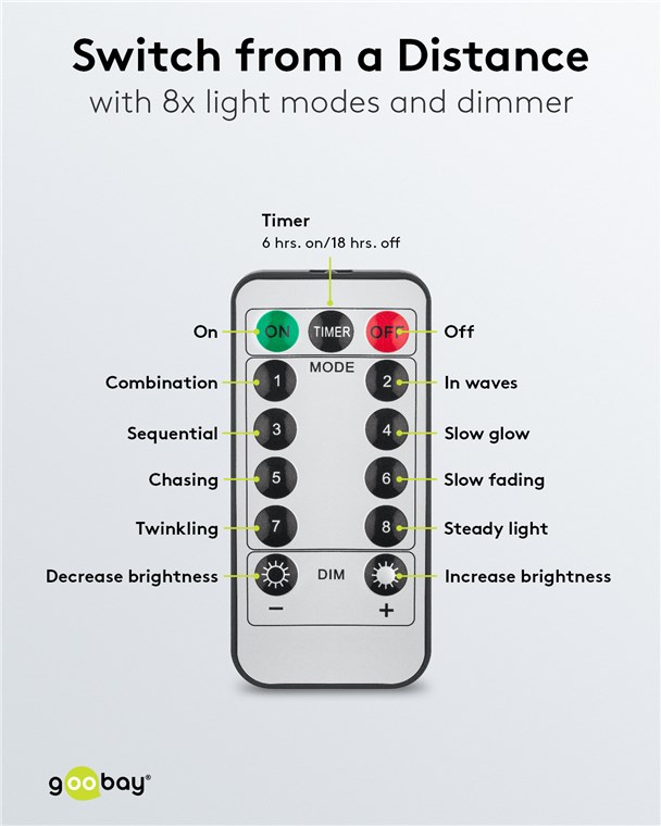• 13-przyciskowy pilot zdalnego sterowania do włączania/wyłączania, timer 6 godz. włączony / 18 godz. wyłączony, 8 trybów i ściemniacz (25%, 50%, 75%, 100%), 1x CR2025 w zestawie
