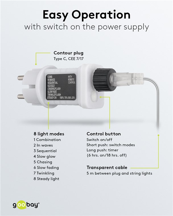 • Adapter wtyczki z 8 trybami (kombinacja, fala, sekwencyjny, powolne świecenie, szybka zmiana, powolne ściemnianie, migotanie, ciągły), timer 6 godz. włączony / 18 godz. wyłączony i funkcja pamięci