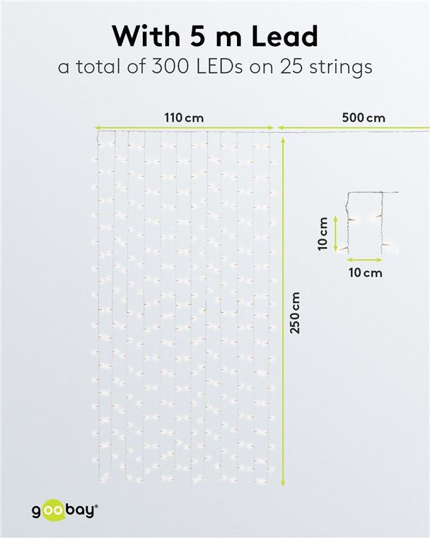 • 12 sznurów po 25 diod LED, każdy o długości 2,50 m