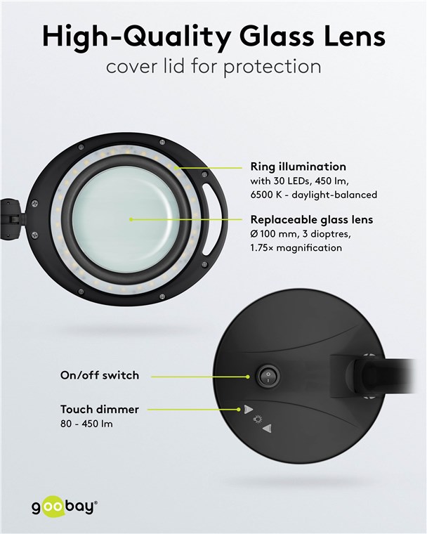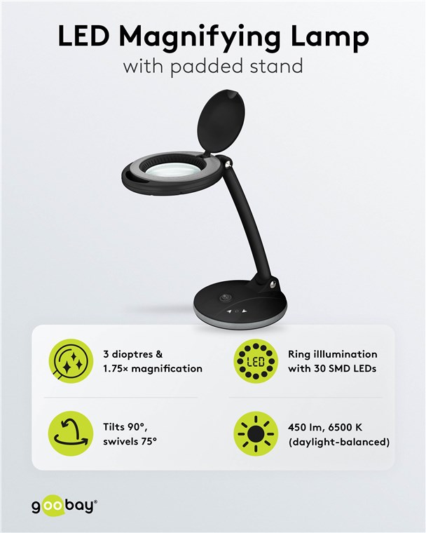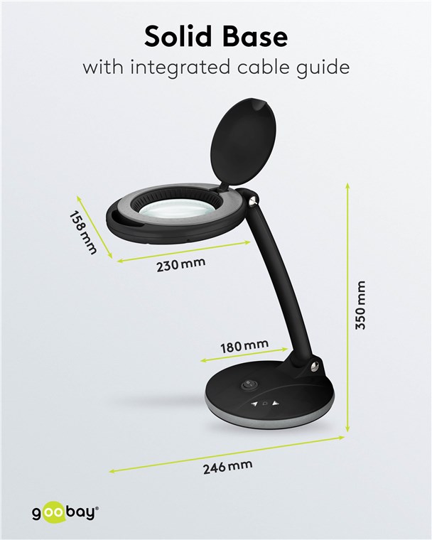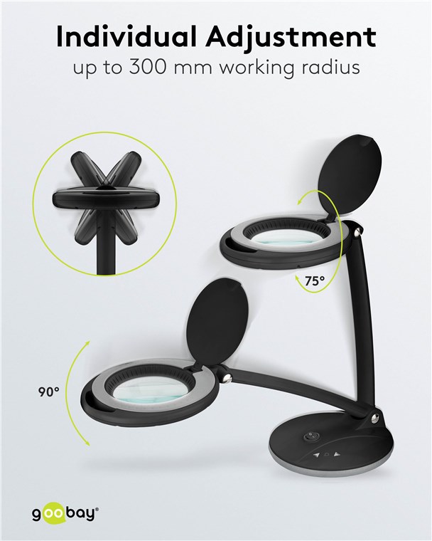 - Głowicę lupy można przechylać o 90° i obracać o 75°, a antypoślizgowa podstawa zapewnia stabilne oparcie na stole.
