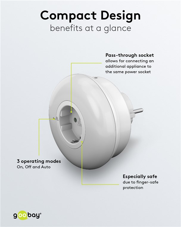 Praktyczna automatyczna regulacja zmierzchowa sprawia, że lampka nocna może pozostać w gniazdku również w ciągu dnia i włącza się automatycznie dopiero wtedy, gdy jasność spadnie poniżej 21 lx.