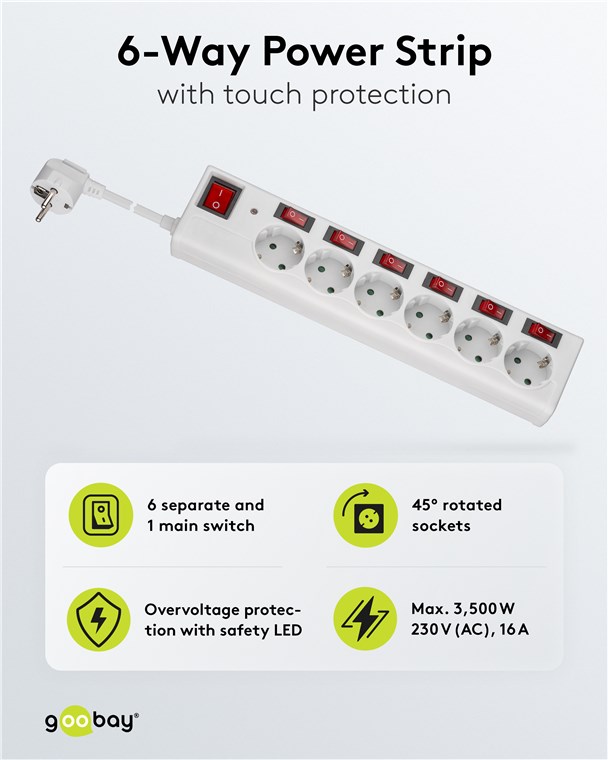 Listwa zasilająca z 6 gniazdami, zabezpieczeniem przeciwprzepięciowym i wyłącznikiem, 1,5